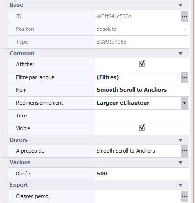 Le calque utilise aussi l'élément Défilement lisse vers les ancres. Nous vous avons expliqué plus haut à quoi correspond cet élément mais il permet de spécifier à chaque lien qui renvoie vers une ancre ou un ID d'voir un défilement fluide. Il est réglé sur 500 millisecondes (valeur par défaut de l'élément).