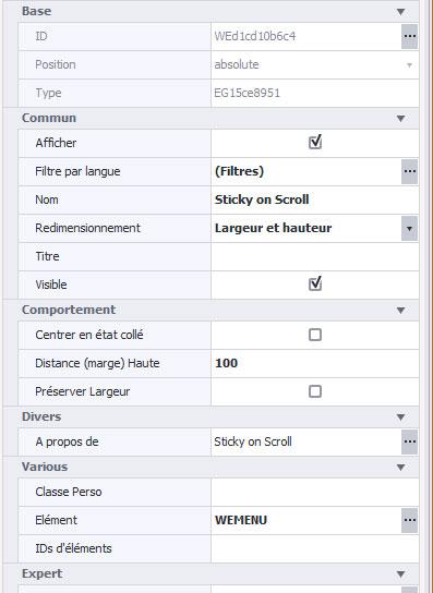 L'autre élément sur le calque est l'élément Sticky (collant) au défilement. Comme indiqué aussi plus haut, il impose à l'élément renseigné de rester collé au haut de la page lors du scroll une fois que celui-ci l'atteint.