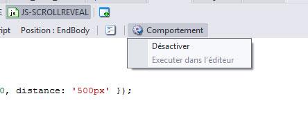 Activent l'animation de l'apparition sur tout élément ayant la Classe Perso apply-smoove. Seulement un de ses blocs doit être actif; pour cela, cliquez une fois dans le bloc de code sur l'icône Comportement au dessus du bloc et activer/désactiver celui-ci.(voir sa propriété Désactivé).