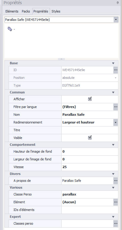 Une fois vos paramétrages finis, mettez au panneau d'éléments la classe parallax (ou autre si vous avez changé la classe dans l'élément).